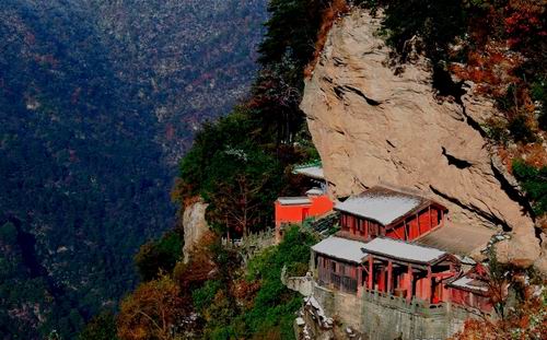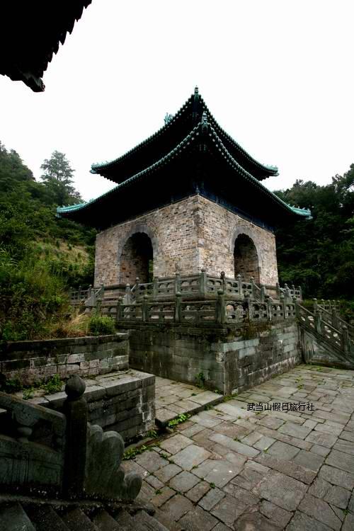 南岩不仅是36岩中的最漂亮的一岩,而且也是武当山中集幽、奇、险于一身的圣之一,常言道:南岩的景色紫霄的杉,人到武当不想家。武当山南天门,南岩宫有两座天门。另外一座就是北天门他们同建于永乐十年,造型与天柱峰二天门相同。 南岩岩中现存的主要殿阁就有龙虎殿、元君殿、天乙真庆宫石殿、两仪殿、南岩宫、皇经堂、太子殿、八卦亭、大殿在民国初被毁,从现在的遗址上可以想象该殿当时有多么地壮观。另外还有试心石、梳妆台、飞升台等景点。 [南天门至小天门],现在展现在我们面前的这座山门叫做小天门,左边是二座龟碑亭,大家不感到很奇特吗?它是依山就势而布局的,进而显得神秘、紧凑、前呼后应。小天门北面的一片左建筑遗址,是南岩宫的道院,据明嘉靖《大岳太和山志》记载,南岩宫是在元代天乙真庆宫故址上扩建的,落成于明永乐十一年,共有殿堂640间,占地面积9万平方米;可见当初的建筑规模是怎样的宏大。站在武当山顶峰俯瞰南岩宫,恰似印证了建在悬崖上的故宫的说法。