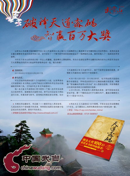 “武当跑酷”,将中外体育交流赛事与武当旅游捆绑宣传;看武当寻宝小说《天道密码》赢百万大奖活动则是文学与旅游的结合,虚拟游戏与实体活动的合璧,“报点”和“爆点”频出,赢得了广泛的关注,有力地拉动了旅游市场,成为武当旅游宣传的创新之举,为今后武当旅游宣传开启了新天地。
