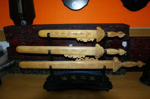 桃木剑即是用精选的桃木,经过纯手工加工、雕刻而成的木剑。这种用桃木制造成的剑,具有辟邪、镇宅、斩妖、除魔等功效,而且对那些脏东西,还具有很强的效果。相传三国时期,曹操因患有头疼之病,喧尽了天下名医,怎么看都没没全愈,后来据自己的一位军师说,用桃木剑挂家里看看,是不是有什么蹊跷。就派人在中原定做了把上好的桃木剑挂在室内,果然头疼病不治就自然痊愈了,而后还南征北战,一直带着那把桃木剑,没再遇到什么古怪的事情,建立了霸业。可见桃木剑辟邪镇宅的效果很是惊人,神奇。后来武当山桃木剑就在民间广为流传,直至今日