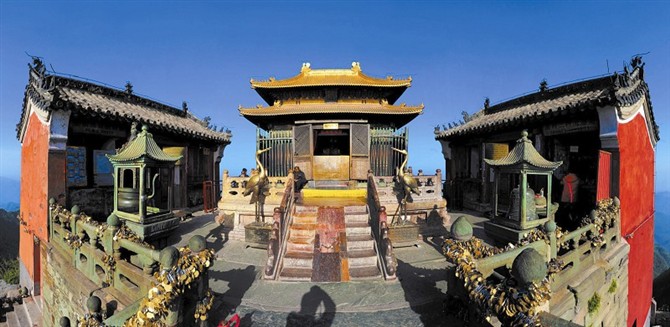 | 武当山金顶皇经堂 皇经堂是道教设醮和早晚开坛功课的场所。也是武当山目前保存最完好的一处清代木雕作品。始建于明永乐年间,道光二十九年(1849年)重建。民国四年再次修茸殿堂三间,为砖木结构,硬山顶,抬梁式木构架。屋顶饰翠缘鱼琉璃瓦,前为廊后为檐,正面为全开式格扇门。面阔三间10.13米,进深9.2米,通高9.9米。额书“白玉京中”四个大字,刚劲有力,金碧辉煌。道家称天上有白玉京,是神仙的居处。又说“老子(太上老君)上处玉京,为神王之宗”。指诸神在皇经堂内,如同天上的白玉京中。额坊隔扇门有木制浮雕的众多道教人物故事和珍禽神兽,雕工精细,形象生动。殿悬挂的金匾上书“生天立地”四个大字,是清道光皇帝亲笔御赐。殿内供奉着主神是真武,两边侍从是金童玉女。左边供奉的是三清尊神,右边奉着观世音,道教称“慈航道人”,这是道教中全真教派三教合一的产物。殿内依次排列的还有灵官、吕洞宾及八仙。 壁画 这八幅壁画为真武修真图,依次排列内容是:(1)辞母进山;(2)黑虎巡山(3)潜心修炼(4)诚心投岩(5)五龙捧圣(6)得道升天(7)仙台受旨(8)巡视三界 朝拜殿 朝拜殿于永乐年间敕建,清康熙后移太和宫,额书“大岳太和宫”,该殿砖石结构,歇山顶式,屋顶饰绿色琉璃瓦。殿内为卷拱式梁架,墙体下部为石雕须弥座,面阔进深为一间,均为8.13米,通高9.45米,殿内陈列真武帝君、金童、玉女和8尊从官神像。过去由于封建等级制度,武当山又称皇家庙观,紫禁城内只有七品以上官员和名人才能通过,朝山信士因不能进入紫禁城,只能在这里朝拜,故称“朝拜殿”。 殿门两旁置有两块铜碑,其一,为明世宗敕建雷坛设像记事碑,碑为嘉靖三十九年(1560年)二月立,为都察院左副都御史鄢卿书;赵成镌碑,碑文记载,在天柱峰北天门外建雷坛、造金像的事迹。其二,为明世宗遣臣致祭真武碑,碑通高1.8米,碑刻有二龙戏珠,下刻“御制”二字。碑边缕刻龙、云等图案。碑文为遣工部右侍郎陆杰祭北极佑圣真君。殿前两侧是钟楼和鼓楼,钟响如雷,波及百里,与方圆百里的九宫九观遥相呼应。道人以钟板为号令进行着有序的修炼生活,俗称“晨钟暮鼓”。殿的左前方有一座小殿堂为万圣阁,里面供奉着各路神仙。 紫禁城 紫禁城亦名红城,又名皇城,因金殿在上而得名。建于明永乐十七年(1419年),永乐十五年(1417年)遣隆平候等督建。圣旨:“武当山古名太和山,又名大岳,今名为大岳太和山,大顶金殿,名大岳太和宫,钦此。”嗣后,在永乐十七年又下一道敕建紫禁城圣旨,敕隆平候张信、驸马都尉沐昕:“今大岳太和山顶砌造四周墙垣,其山本身不要分毫修动;其墙务在随地势,高则不论丈尺,便人过不去为止;务要坚固壮实,万万年与天地同其久远,故敕”。整个城墙周长344.43米,高因依山就势数丈不等。南城门基厚2.4米,城墙顶厚1.26米,金城占地面积34443平方米。均用石条砌成,每块石条重达这千余斤。该墙利用古代建筑中的力学收分方法而砌。从里看往外倾斜,从外看往里倾斜,历经600年它确捍然不动。四周设有东、西、南、北四座天门,全是青石雕制,造型庄严,象征天阙。工程浩大而艰巨,描绘了古代劳动人民的创造智慧,全城东、西、南、北四座天门只有南天门可通,其它三门均为妆饰。南天门处设有三座门,中为神门,只有斋醮大典时才能启用。右边是鬼门,无门可开。左边是人门,凡进入紫禁城朝拜者,均从这里经过。人门内中线石墁有一鱼纹。内设有一机关,设定机关启开时间,凡在这里失足者被认为是有过之人。 方振武碑文 方振武,位吉鸿昌的部下,是一名抗日将领。他诗文:“万丈雄山势欲奔,峰高五岳接天门,秦皇汉武封禅日,不受虚荣亦自尊”。前两句描绘武当云海有万马奔腾之势,其山之誉不在五岳而超出五岳。封禅是指祭祀天地,指秦始皇、汉武帝当年在泰山祭祀时,武当山还名声不扬。“不受虚荣亦自尊”,其语双关。其一,反映了作者因极力主张抗日而受蒋介石的歧视、排斥和放逐。其二,诗中自言其志地表达了坚定的抗日气节,掷地有声,虽英雄无用武之地,但愿寄托于武当山的神威。方振武将军的孙子陈方安先生是香港原内政部部长,现居香港。 灵官殿 灵官殿建于明代。依岩建造的小石殿,殿内置锡制小殿。殿内锡制灵官像于1975年被吴某盗走砸毁,后吴某依法判刑。殿门横联是道光十八年拾眩“北极通枢”,是指金殿供奉着北极玄天上帝,凡过往信士都要经过灵官爷的识别检验。入殿口放置数根重达百余斤的钢鞭,是灵官爷的刑具;道教称灵官爷有三只眼,能识人间善恶,且铁面无私。过去,在信士中有过之人,欲钢鞭吓得魂飞魄散,有楹联文证:上联天知地知未有不知,下联善报恶报迟早要报,横联善恶分明。 殿内陈列有6块历代皇帝在武当山举行斋醮活动的记事碑。第一块碑记洪熙元年二月,仁宗皇帝遣礼部侍郎胡莹致祭于真武神。胡莹,在永乐年间受朱棣秘旨,在鄂、川、滇一带查证建文皇帝的下落。常有锦衣卫在武当山一带活动。据史载,胡莹在一次上朝前,与永乐皇帝耳语了几句话,朱棣表现得十分兴奋,当朝宣布胡 任礼部侍郎。大臣们猜测,都认为是有关建文皇帝下落的结案,但结案如何,谁也无法知道。第二块碑记载,宣德元年,宣宗皇帝遣太常寺丞袁正安致祭于北极真武之神。第三块碑刻记载,正统元年英宗皇帝遣平江北左镇致祭于北极真武之神。第四块碑记