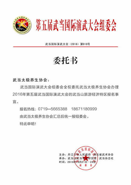 为了进一步推动中华传统武术的传承发展,造福人民大众身心健康,定于2016年10月20日至24日,在武当山下的丹江口市举行第五届武当国际演武大会。